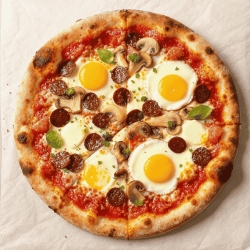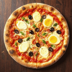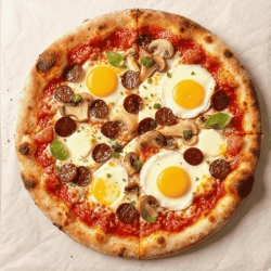 Sauce tomate ou Crème fraîche, mozzarella, merguez, oignons, poivrons, oeuf, olives