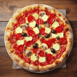 Sauce tomate ou Crème fraîche, mozzarella, champignons, poivrons, maîs, oignons, olives