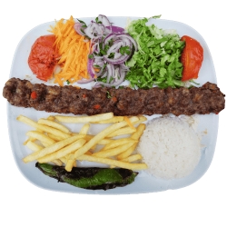 Galette de brochette de viande hachée épicée, avec frites